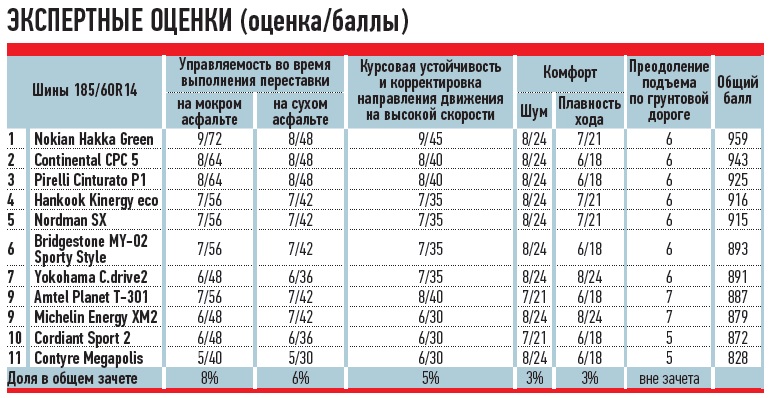 Первое место занимает «Нокиан-Хакка Грин», сравнительно прошлогодним результатом, марка поднялась со второго места, набрав победные 959 баллов благодаря модернизации смеси и новой конструкции в "мокром" направлении. «Нокиан» сильно оторвались от своих конкурентов «Континенталь» которые получили вместе со своей новой разработкой «КонтиПремиумКонтакт 5» получили 945 баллов и заняли почетное второе место в списке. Особенно радует, что в рубрике «Наши замеры» представители обеих марок шин получили из возможных 750, более 748 баллов, с чем их и поздравляем. «Нокиан», изготовленные в России и которые имеют финские корни, весьма дороже немецкого «Континенталя», который производится в Португалии, а именно из-за этого наблюдается существенная разница по соотношению своей цены с качеством. С того года «Пирелли-Чинтурато P1», крепко занимает свое почетное третье место и набирает весьма достойные 925 баллов. С результатом в 916 балов на четвертое место попадает корейский производитель «Хэнкук-Кинерджи эко». Данная компания славится тем, что постоянно улучшает качество своего товара, именно это позволило корейской фирме улучшить показатели в рейтинге и подняться с прошлогоднего двадцатого места. Закрывает первую пятерку торговый бренд «Нордман», уступив корейским конкурентам всего один балл. Следующее место занимает «Бриджстоун MY-02 SS», набрав 893 балла, качество, которое было достигнуто моделью «Туранза ER 3000» в прошлом году, осталось на том же уровне, а соотношение цена/качество равняется 0,73, значения равные бренду «Нокиан», который занимает место куда выше. Набрав 891 балл, следом расположился «Иокогама-С.драйв2», и пусть результат прошлогодней модели удалось улучшить практически на 50 пунктов, соотношение качества с ценой 0,70, считается явно завышенным. Рядом расположился русский производитель «Амтел-Планет T-301». Похоже, что родство с «Пирелли» влияет весьма положительно, раз удалось достигнуть высокого качества. Коэффициент цена/качество 0,60, - является самым заманчивым. На девятом месте оказался«Мишлен-Энерджи XM2» набрав 879 баллов. По большому счету данная модель является усиленной версией прошлогодней популярной «Энерджи Сейвер». Лучшую десятку по версии теста замыкает исключительно отечественный производитель «Кордиант-Спорт 2». Набрав 872 балла, он улучшает свою позицию практически на 20 баллов. «Контайр-Мегаполис», набрав 828 баллов, оказывается на одиннадцатом месте нашего теста, что еще раз доказывает то, что тягаться маленькой фирме наряду с матерыми весьма сложно.